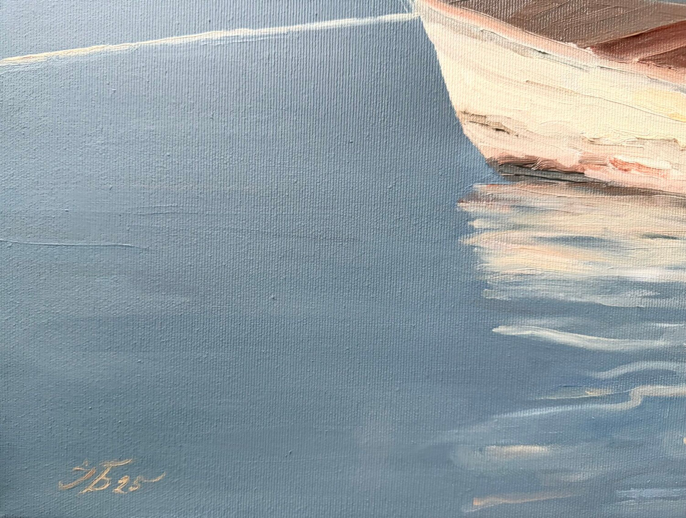 This painting is about the city of Trogir in Croatia. It captures a beautiful morning view of the city after the rain, with morning light falling on a narrow street and white stone chairs near a cafe.