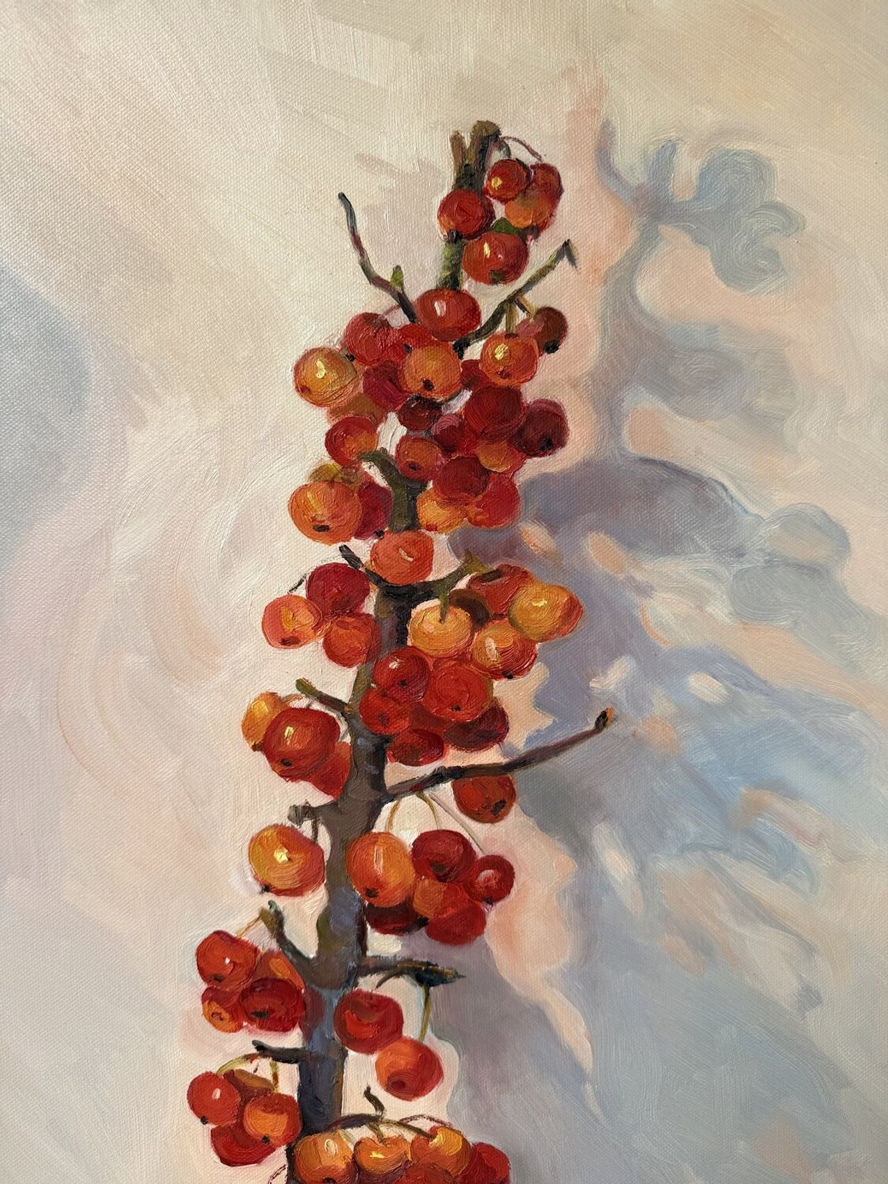A branch with autumn paradise apples on a brown-gray background of unpainted canvas.