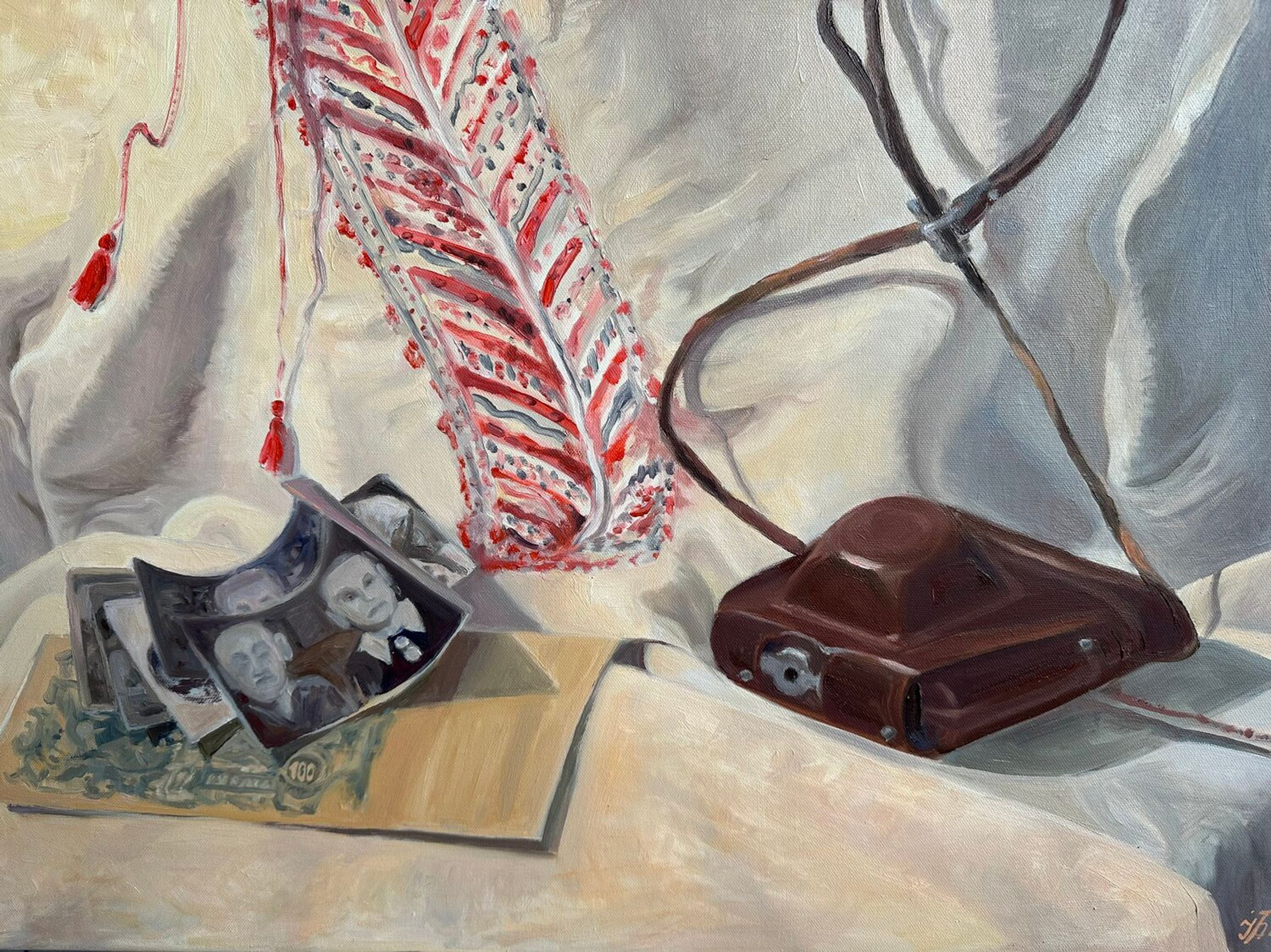 A touching tribute to heritage and memory. The painting depicts photographs of grandparents, household items that keep the warmth of the family. Each element is filled with memories.